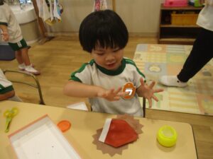 大きな栗を園に持ってきてくれた子がいたので、年少たんぽぽ組さんは急遽、折り紙での栗作りも行いました。