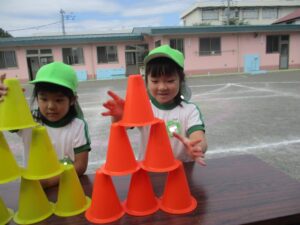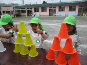 重なって置かれている六つのコーンをピラミッドのように積み、園児席に「パッ!」と決めポーズをして下さい。