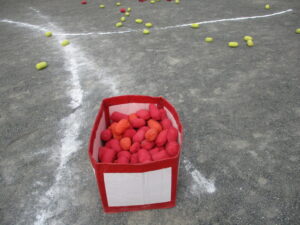 箱から赤い玉を一つ手に取り、線からカゴに投げ入れて下さい。