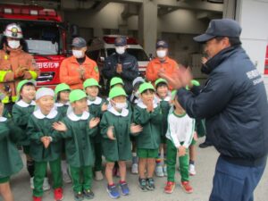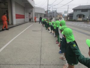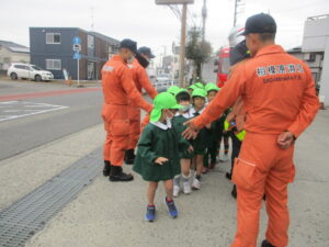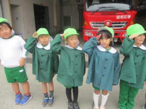 礼式訓練ではカッコいい「きをつけ」と「敬礼」の仕方を教えてもらったり、卒園児の消防隊員の方と一緒に園歌を歌ったりと、とても楽しい時間を過ごせました。