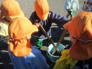 今日は年少たんぽぽ組さんが、明日の白菜スープに入れる野菜を畑に収穫しに行ってくれました。