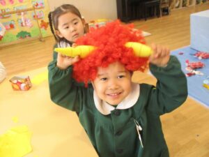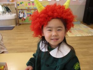 鬼のお面や鬼のパンツを作り、2月3日の豆まきに興味津々の年少たんぽぽ組さん。