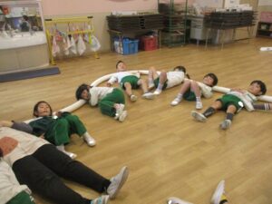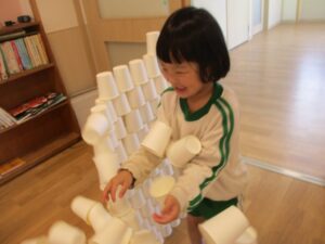 年長まつ組さんは年長児らしい集中力を求めて、紙コップを使った遊びを行いました。