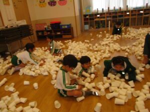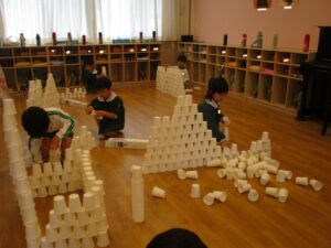 昨年度の年長さんも度々行ってきた『紙コップインスタレーション』という活動。