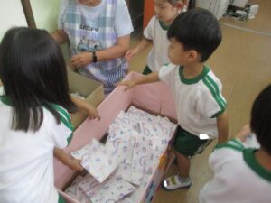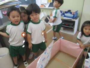 プレゼントが入っている箱は、年少たんぽぽ組さんの手作りなんですよ。