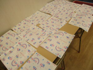 プレゼントを入れる袋は、年長まつ組さんが一つ一つ糊付けして作ってくれました。