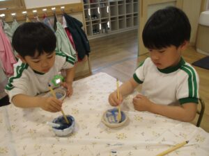 年長まつ組さん、今日はお皿の絵付けを行いました。